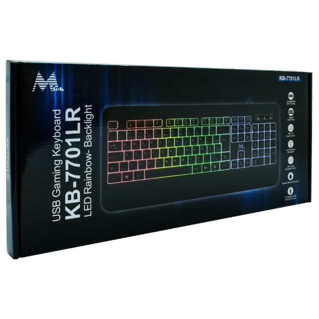 - Marca: Mtek - Modelo: KB-7701LR - Interface: USB - Idioma: PT-BR ABNT 2 (com ç) - Resistente a respingos d’água - Teclas simultâneas com sistema de membrana - Teclado ultrafinas com 4 mm - Efeito de iluminação rainbow - Possui 12 teclas multimídia - LEDs indicadores de uso - Apoio de descanso para os pulsos, tornando o uso mais confortável - Comprimento do cabo: 1,4m